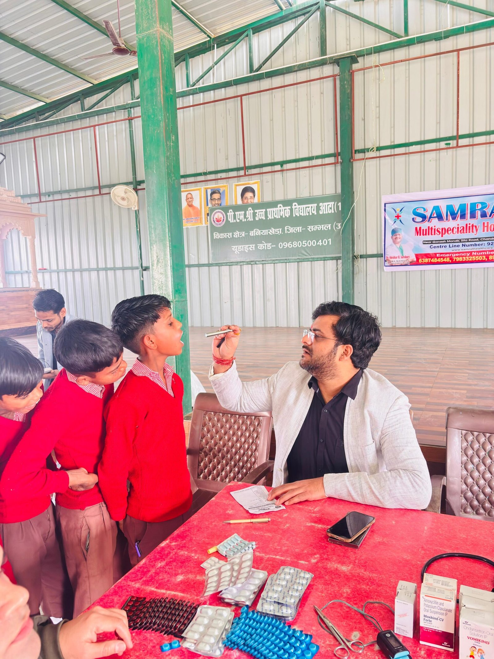 आज पी.एम.श्री उच्च प्राथमिक विद्यालय आटा, वि.क्षे.-बनियाखेडा, जनपद -संभल,उप्र में डॉ. शेखर वार्ष्णेय (MBBS, MS) सम्राट हॉस्पिटल द्वारा हर माह आयोजित होने वाला स्वास्थ्य परीक्षण कैम्प आयोजित किया गया । विद्यालय में उपस्थित सभी बच्चों का स्वास्थ्य परीक्षण किया गया तथा बदलते मौसम से होने वाले रोगों के बारे में विस्तार से जानकारी दी गई। बच्चों को इन बीमारियों से बचने के बारे में बताया गया एवं उन सबकी जांच की गई जैसे बुखार, जुखाम, आंखें का दर्द,पेट दर्द आदि |